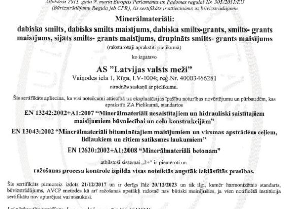 - 2020.gadā izsniegtā sertifikāta ietvaros šī gada rudenī AS “Latvijas valsts meži” apsaimniekotajās derīgo izrakteņu ieguves vietās norisinājās minerālo materiālu ražošanas procesa kontroles sertifikācijas uzraudzības audits, kuru veic neatkarīga sertifikācijas organizācija SIA “Bureau Veritas Latvia”. Audita laikā tiek novērtētas LVM Zemes dzīles ieviestās kvalitātes kontroles, paraugu ņemšanas un ražošanas procesa pārvaldības procedūras.